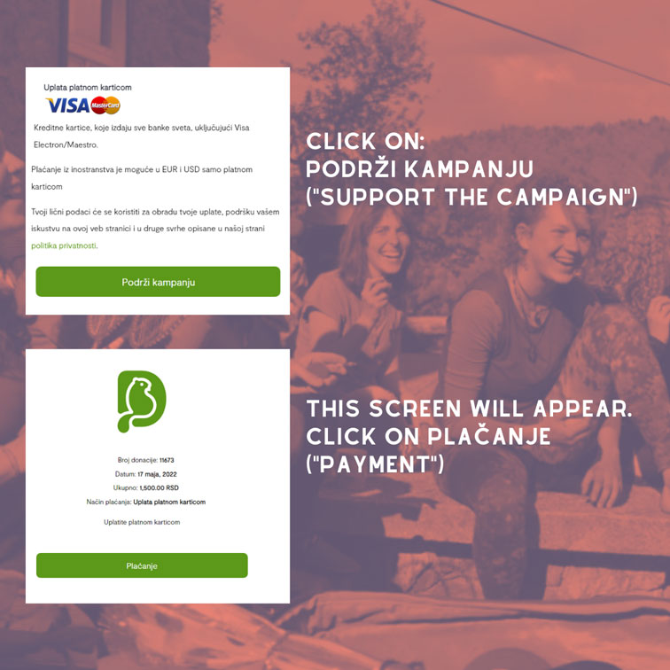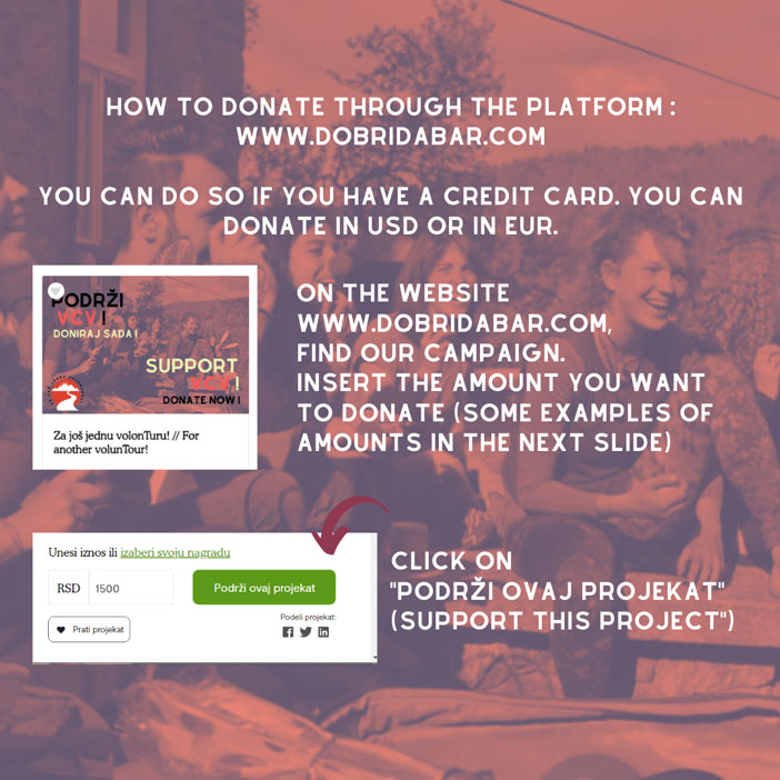 - Donating by choosing payment option in EUR or USD on the platform “Dobri Dabar”. If you don’t speak Serbian, scroll at the end of the page to see how to use it.